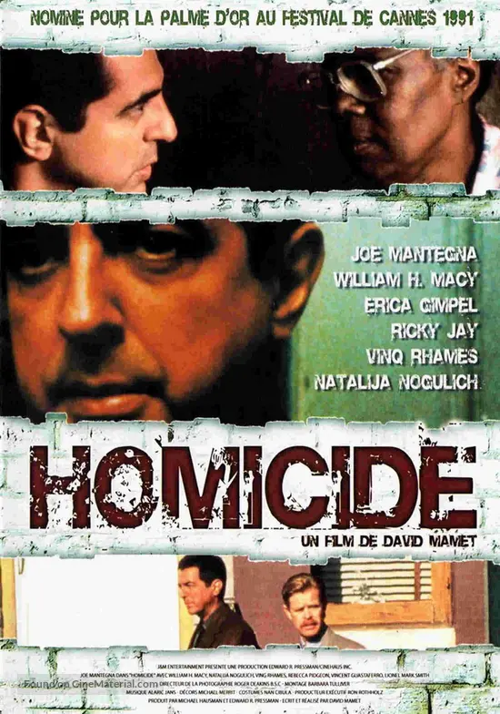 La tercera película como director de David Mamet fue Homicidio, drama policial de ajustado presupuesto en el que la modestia de la puesta en escena no oculta las elevadas pretensiones del autor a nivel temático. La respuesta del público, que seguramente esperaba un thriller más al uso, fue escasa, y las críticas se dividieron entre quienes hablaron de un logrado ejercicio de estilo y quienes, por el contrario, pregonaron que Mamet perdía fuelle después de su afortunado debut con Casa de juegos, obra con la que Homicidio tiene mucho en común. De cualquier manera, subrayo desde ya que estamos ante una buena película.